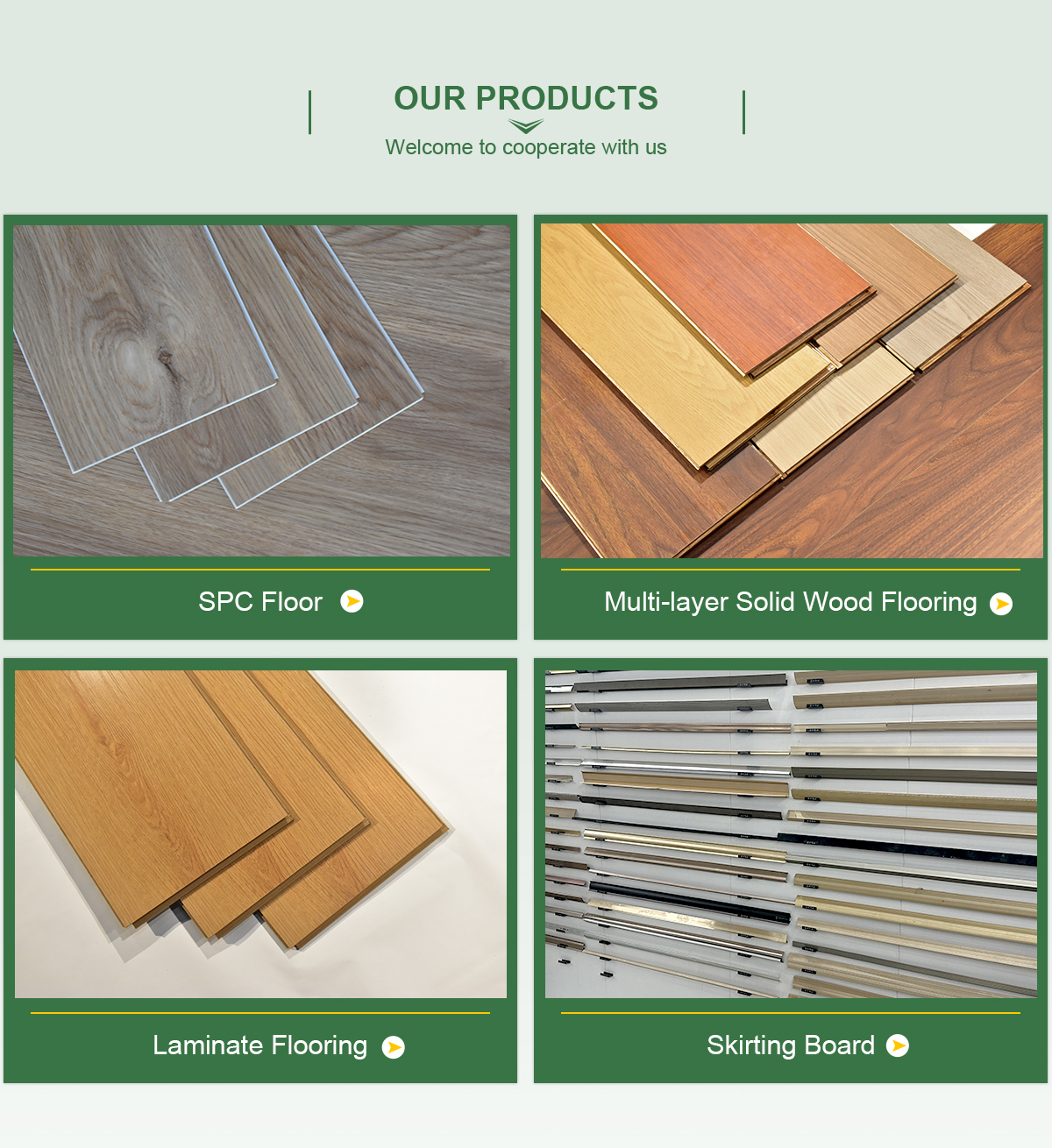 Productos principales:Suelo SPC, suelo laminado, suelo de madera maciza multicapa, accesorios para suelo
